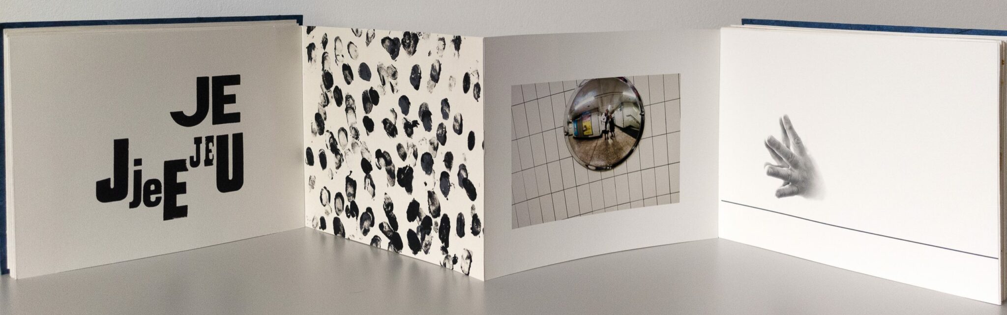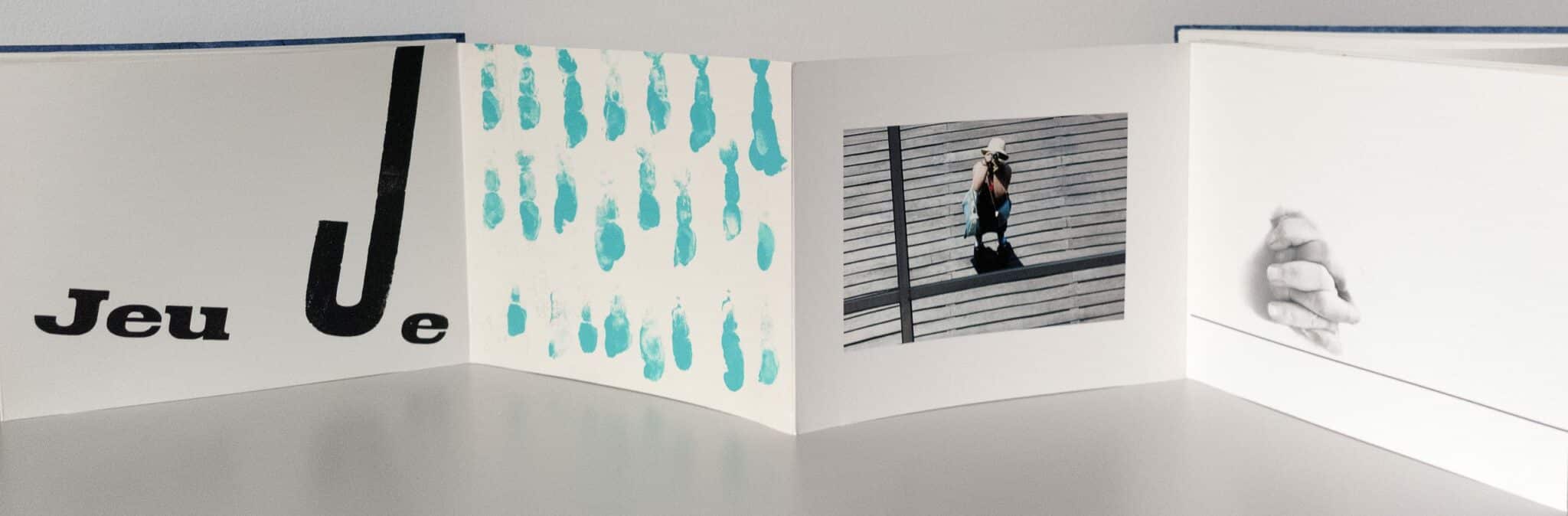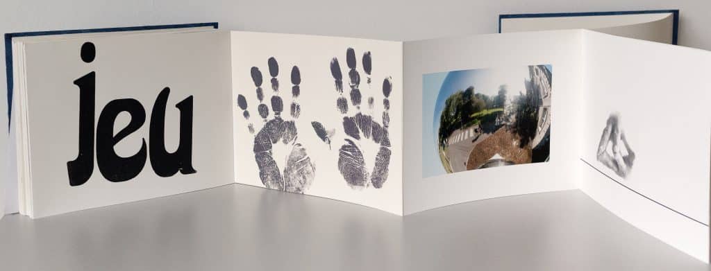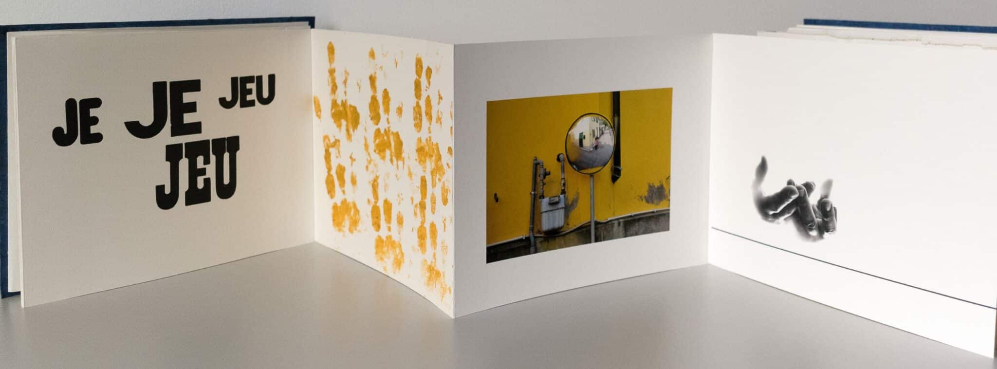 Au fil de mes voyages, dans les miroirs des rues, je me reflète, les mots « Jeu » et « Je » se mêlent sur les pages et sont imprimés avec des bois d’affiche, j’ai photographié mes mains et ai fait leurs empreintes pour illustrer ce livre.