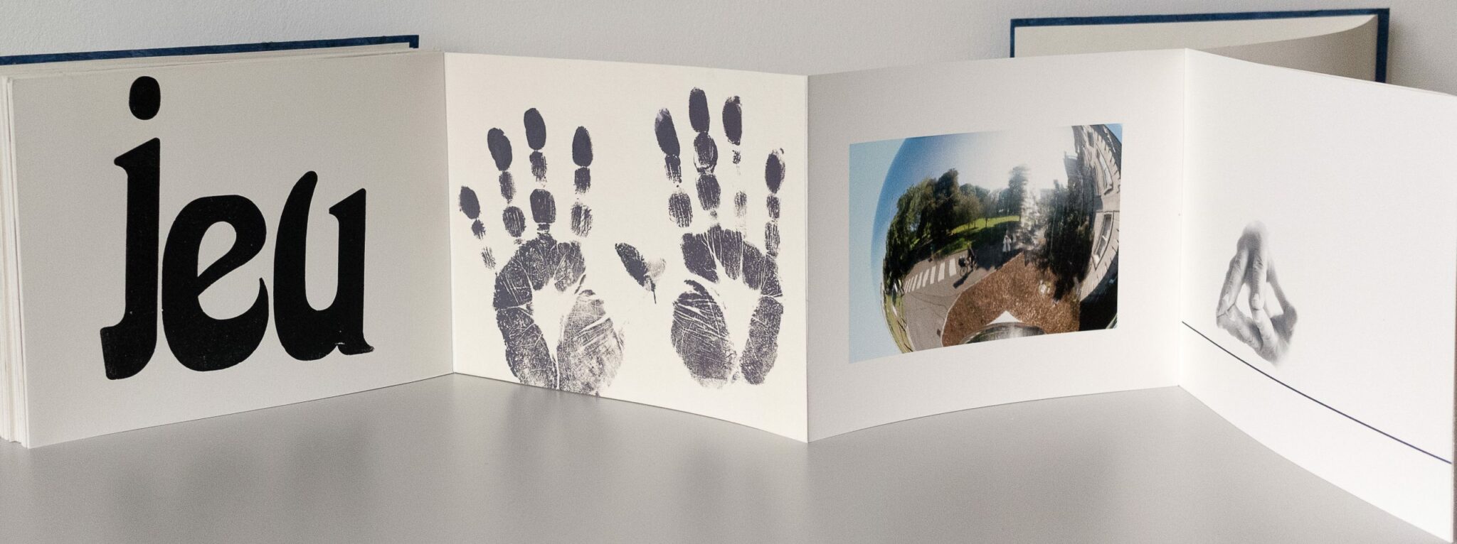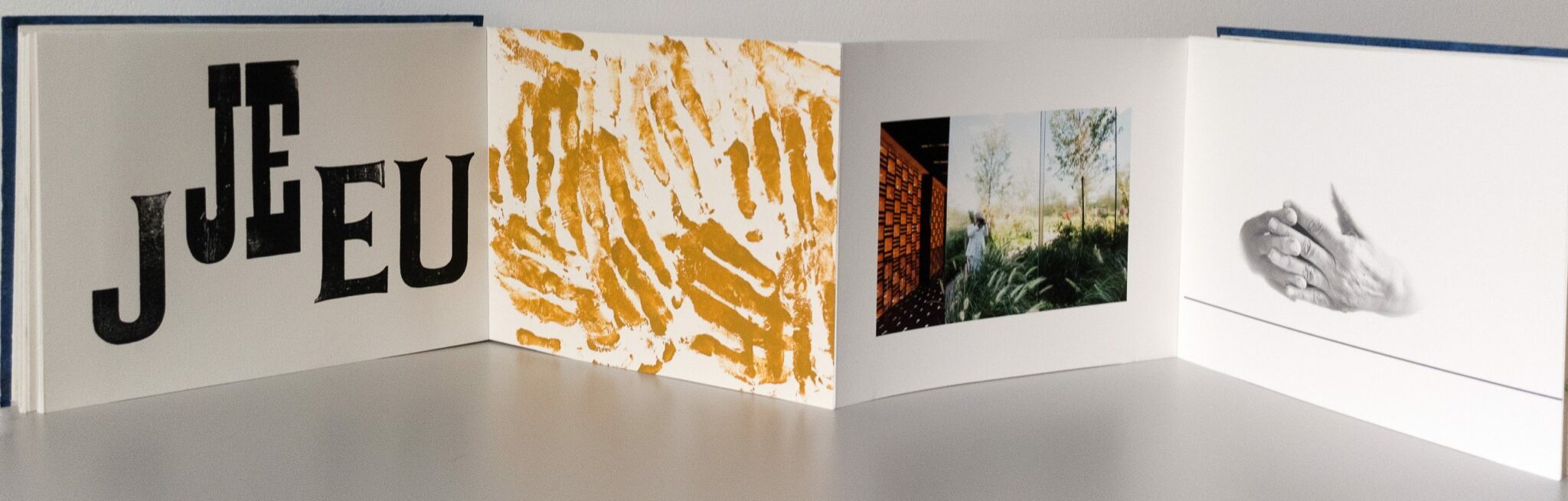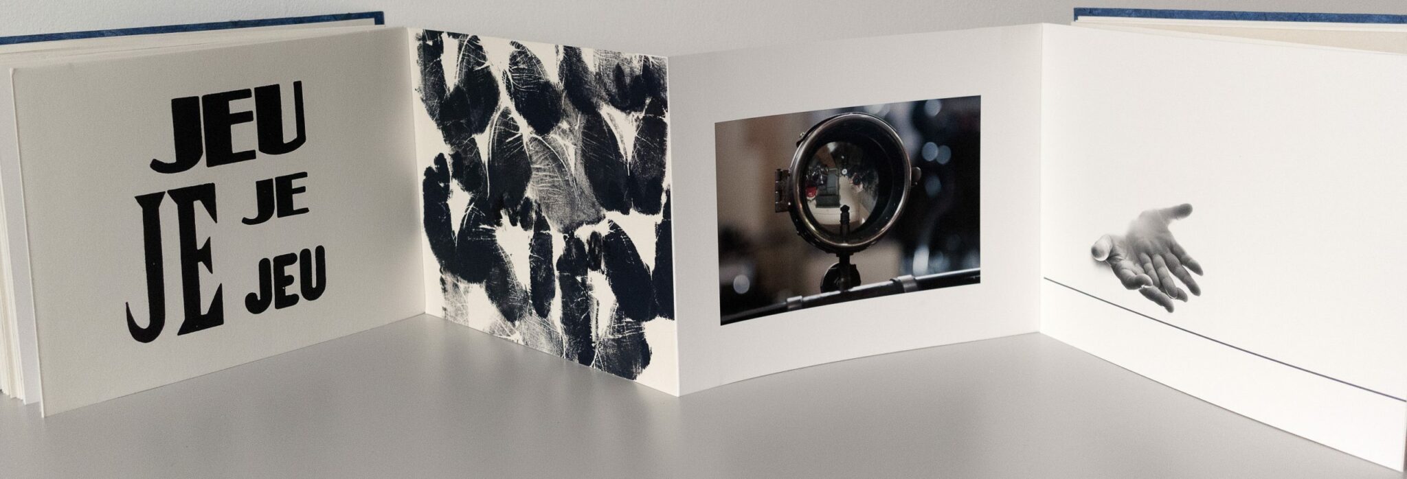 Au fil de mes voyages, dans les miroirs des rues, je me reflète, les mots « Jeu » et « Je » se mêlent sur les pages et sont imprimés avec des bois d’affiche, j’ai photographié mes mains et ai fait leurs empreintes pour illustrer ce livre.