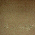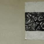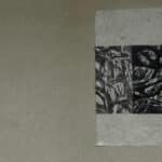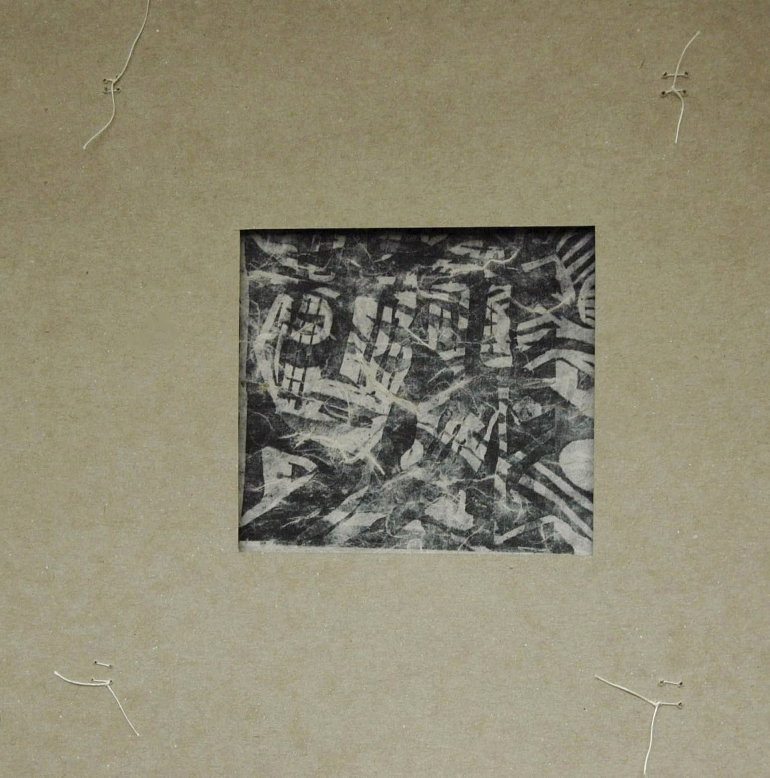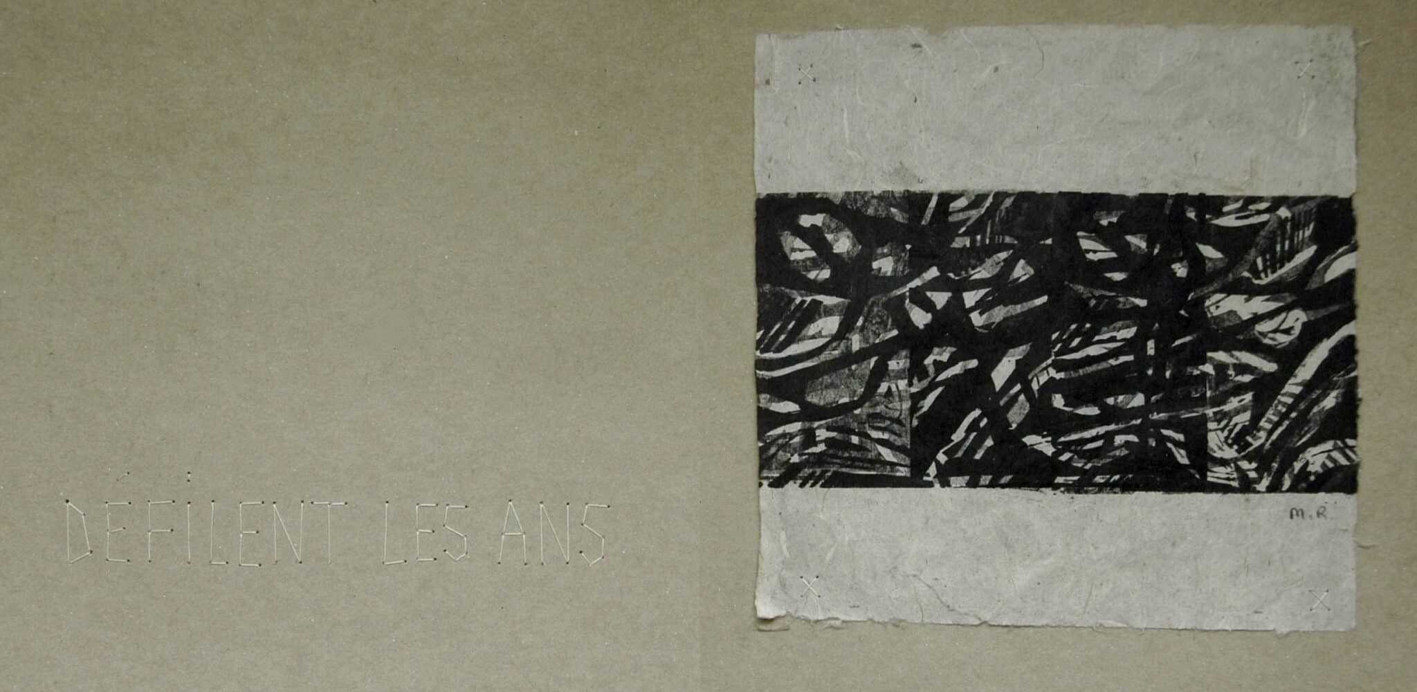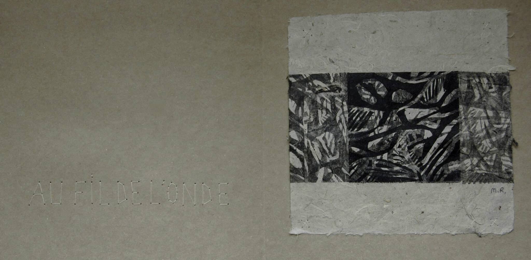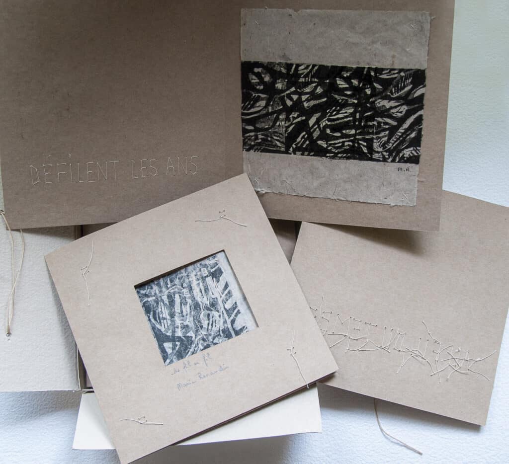 Pages libres de carton brun pliées avec linogravures sur papier végétal cousues dans une fenêtre découpée et visibles recto verso.