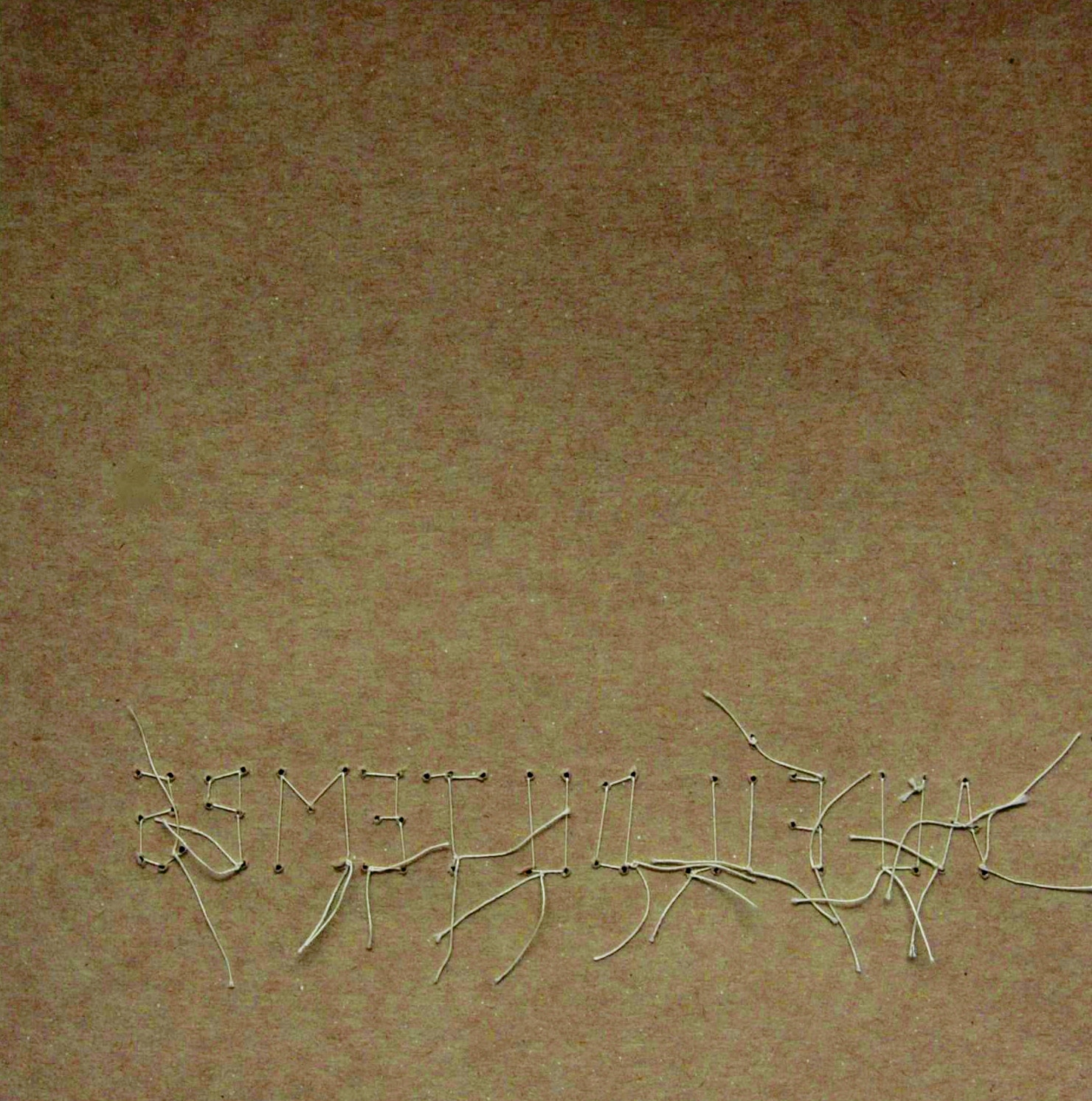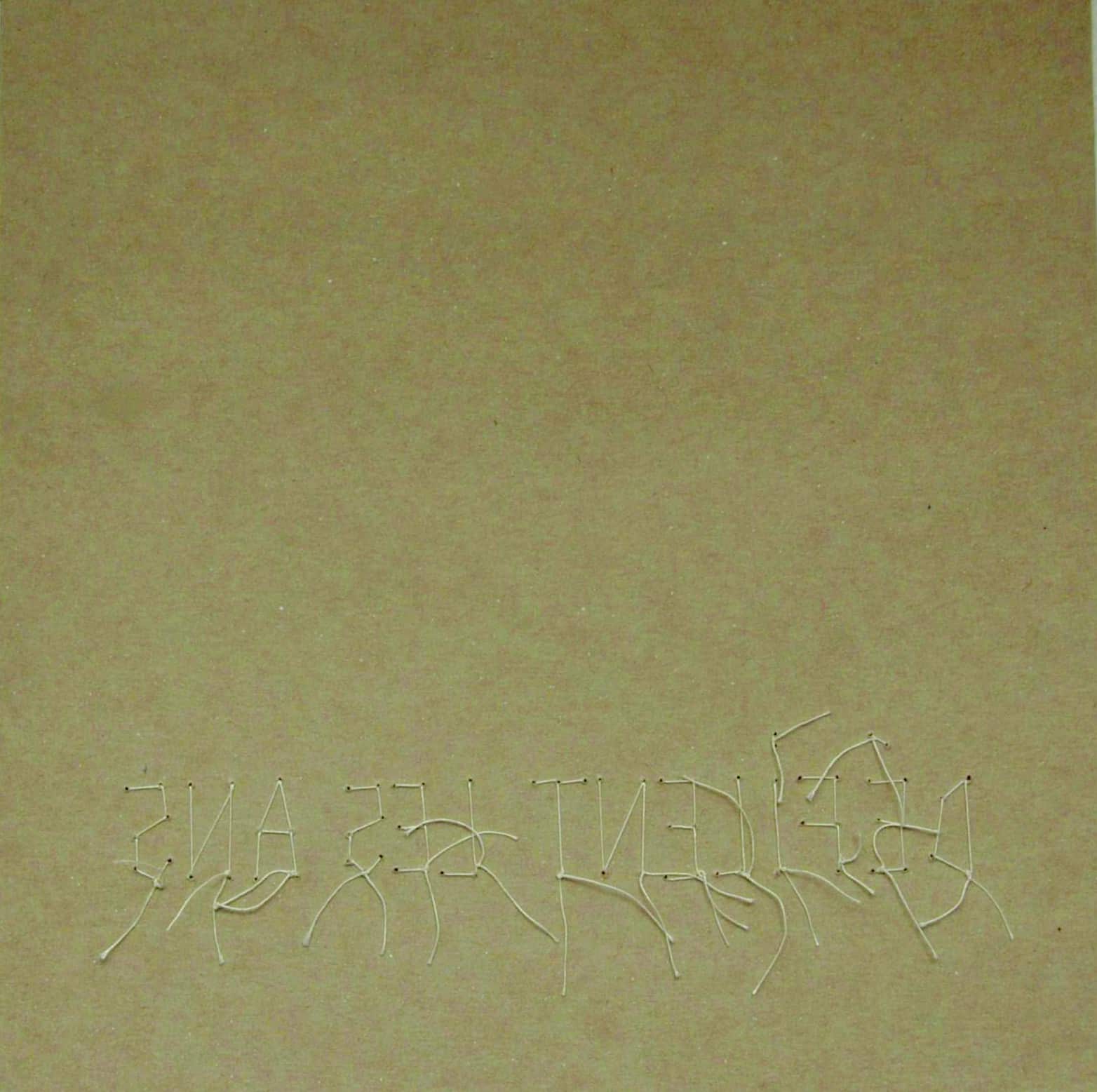 Mots cousus en fil blanc sur chaque page visibles recto-verso.