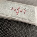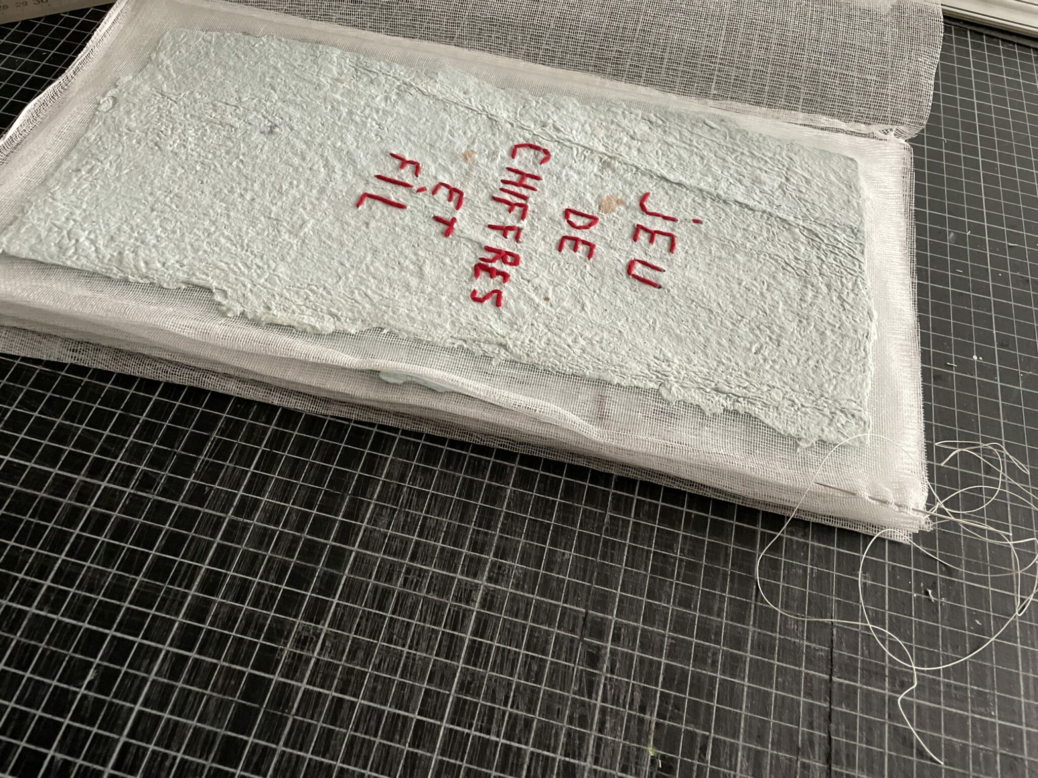 Ce livre d’artiste est un exemplaire unique, il se compose de papier fait à l’atelier, les chiffres sont imprimés avec des bois d’affiche et le fils rouge est une ponctuation pour chaque page, elles sont contrecollées sur de la tarlatane.