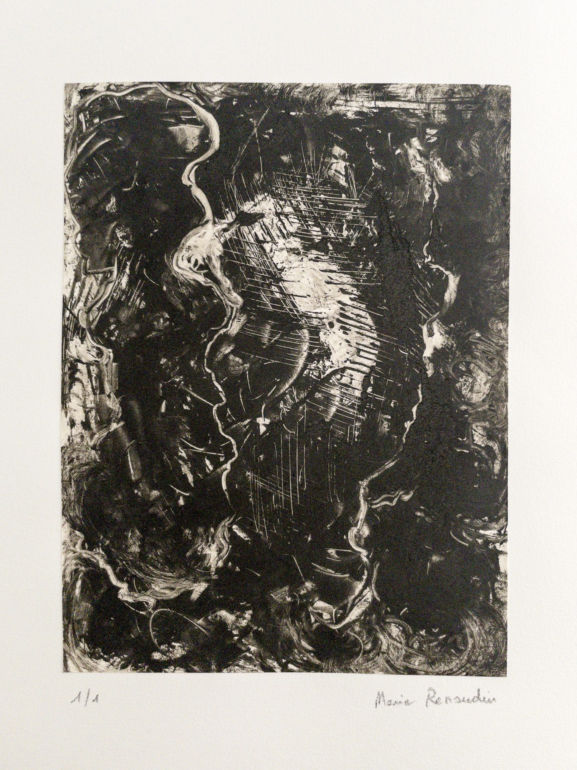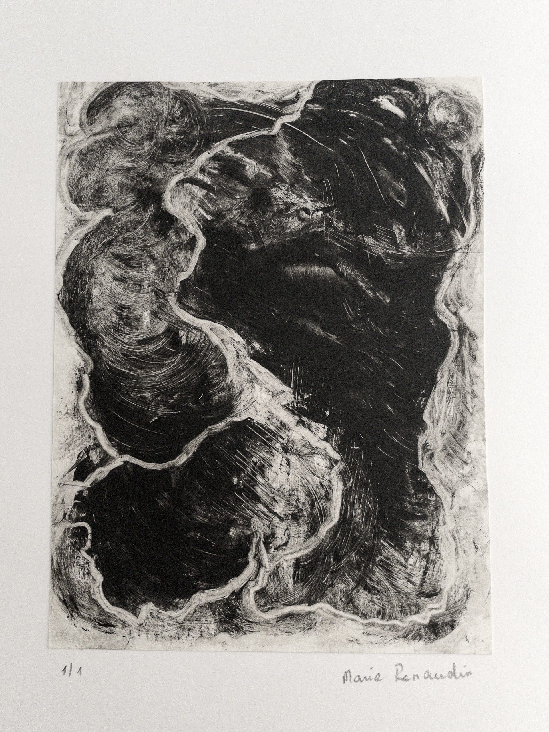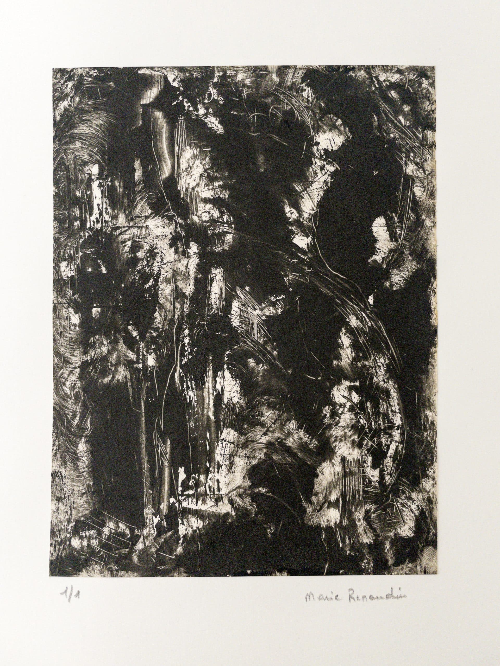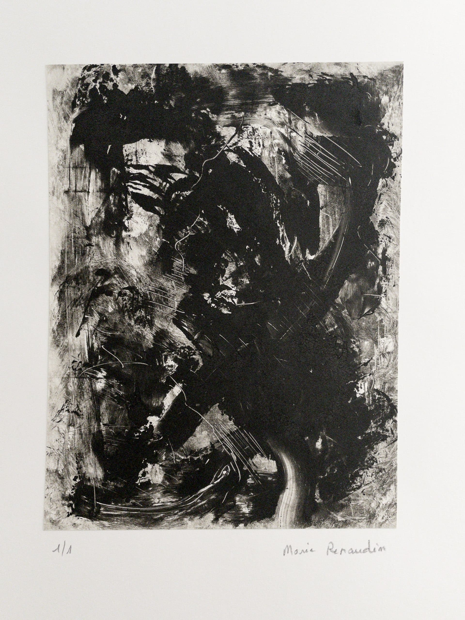 Le monotype résulte de l’impression sur papier d’un dessin à l’encre d’imprimerie directement créé sur une plaque. Il s’imprime généralement en un seul exemplaire, un deuxième ou troisième état plus clair est parfois possible.